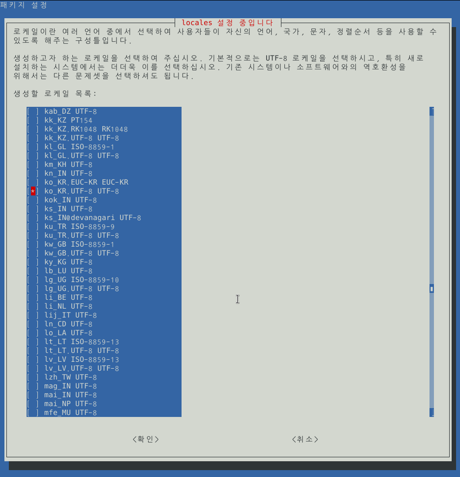 ko_KR.UTF-8을 찾아 스페이스키를 눌러 선택한 후 탭키로 이동하여 <확인>을 누른다.