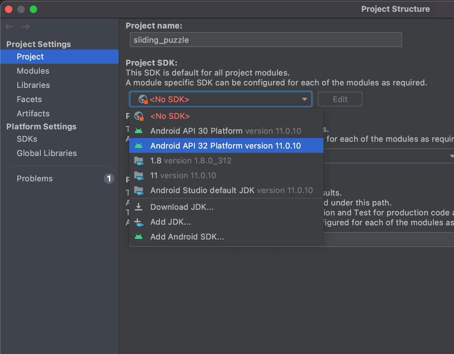 Project Structure설정에서 Android SDK를 설정하면 된다.