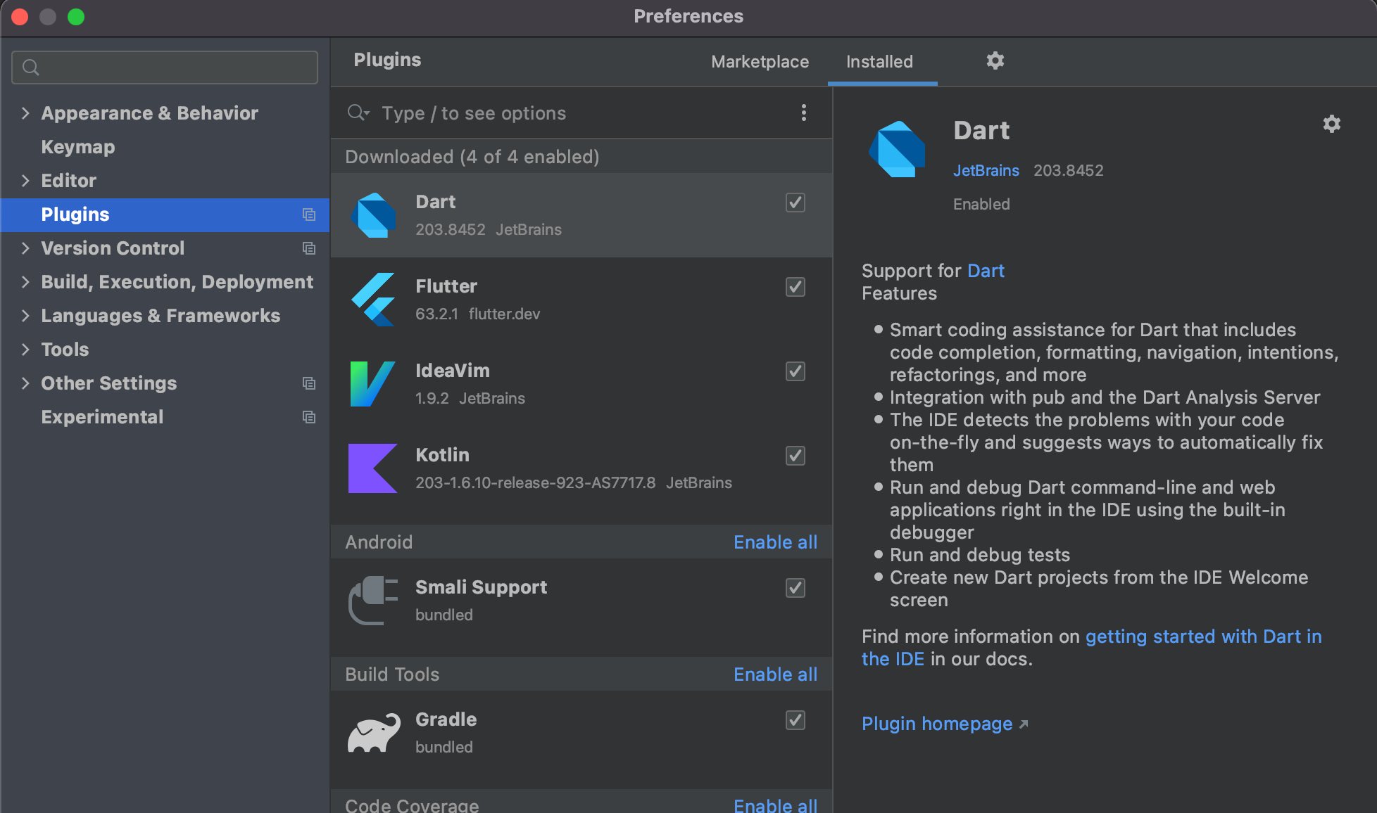 안드로이드 스튜디오를 실행하고 Dart, Flutter Plugin을 Marketplace에 검색해서 설치한다.