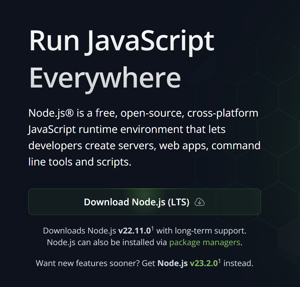 Node.js 홈페이지 접속하여 LTS(장기 지원) 버전 또는 Current 버전을 선택하여 다운로드 한다.