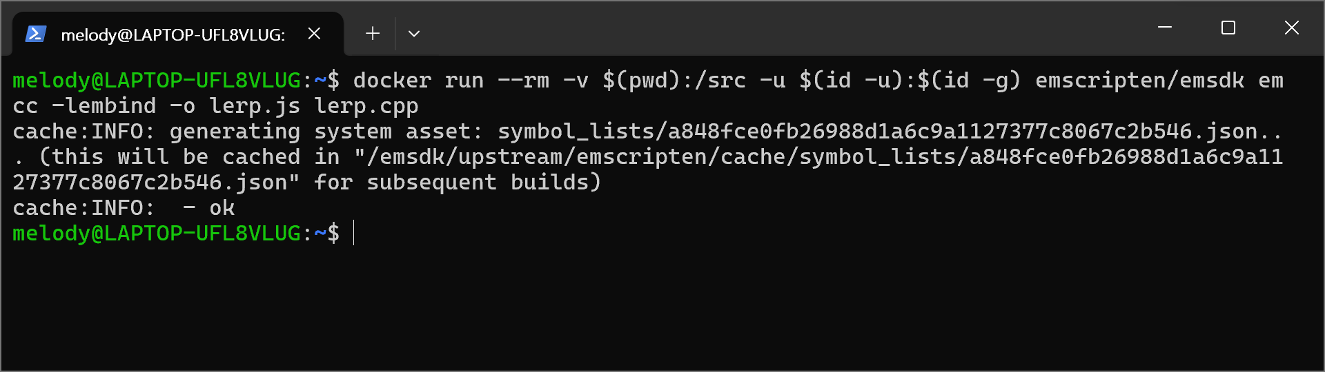 EMSCRIPTEN_BINDINGS() 블록을 사용하여 C++ lerp() 함수를 JavaScript에 노출한다.
