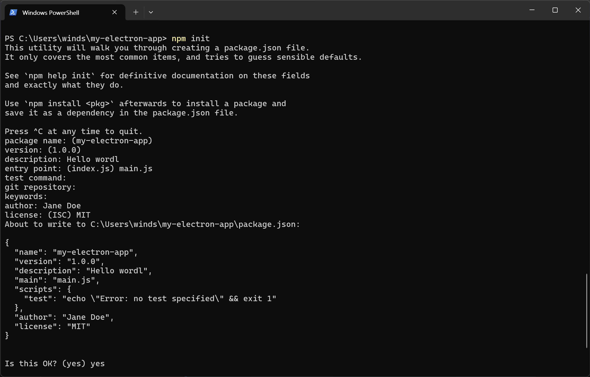 my-electron-app 폴더를 만들고 그 안에 npm 패키지를 초기화하는 것으로 시작한다.